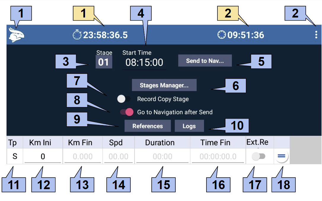 The stages can be edited at any time, even during the rally. Whenever you change the stage you are running, don’t forget to send the data to the Navigation on the Stages screen.
