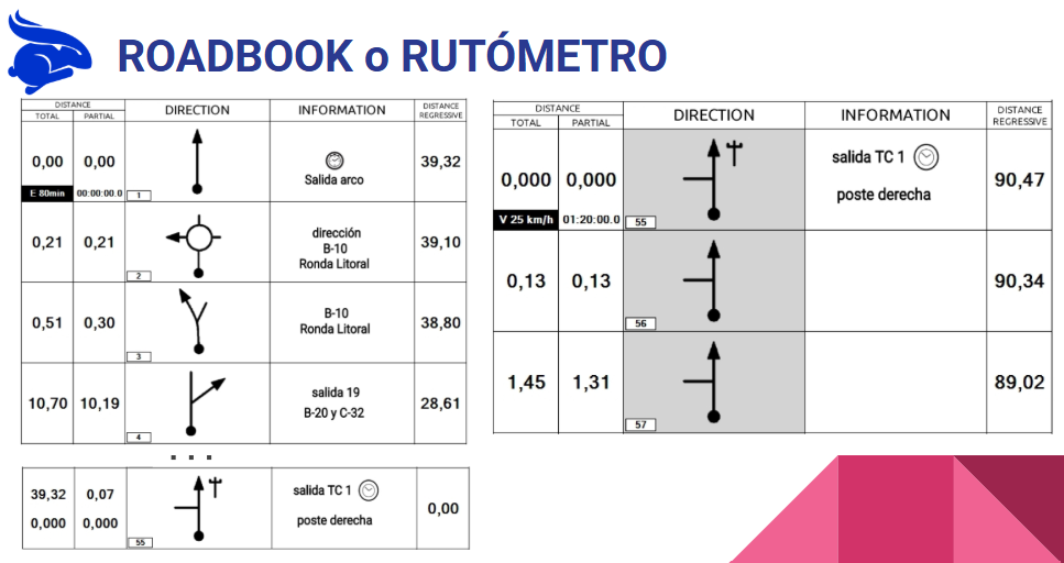 Roadbook o Rutómetro – Es el libro donde encontramos todo el recorrido del rally en formato de referencias y viñetas. Cada línea del roadbook es una referencia donde encontramos el kilometraje total, parcial, viñeta e observaciones.