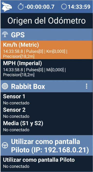 6. En la página de conexiones del Rabbit Rally 2.0 y seleccione Km/h (Metric) o MPH (Imperial) en GPS, como se muestra en la imagen a continuación.
